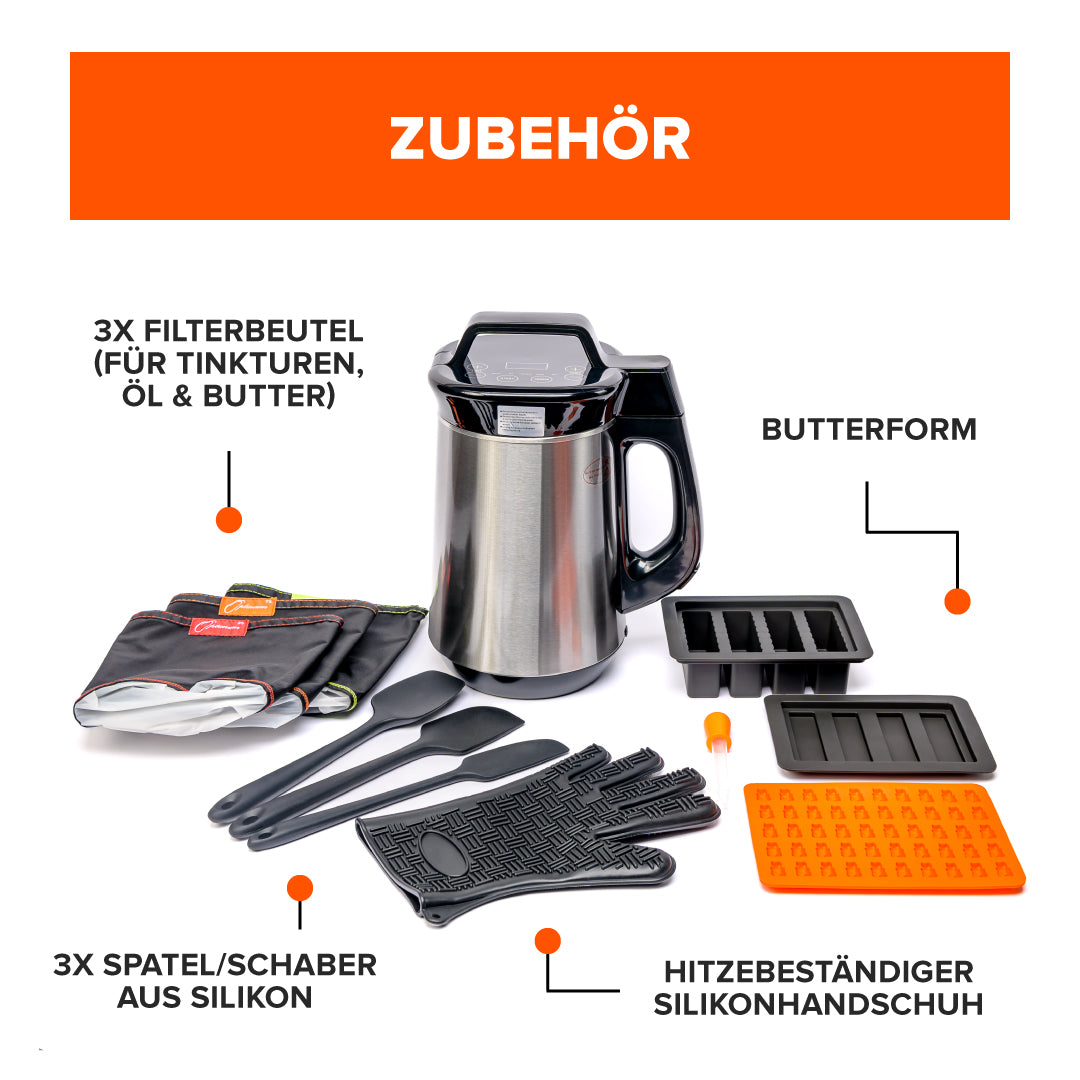 | Zubehör: | 2l BPA freier Mixbehälter mit Deckel und Kappe, Stößel (Stampfer), Spatel, Nussmilchbeutel, 100+ Seiten Rezeptbuch, Bedienungsanleitung | 2l BPA freier Mixbehälter mit Deckel und Kappe, Stößel (Stampfer) mittel, Bedienungsanleitung, Rezeptbuch |